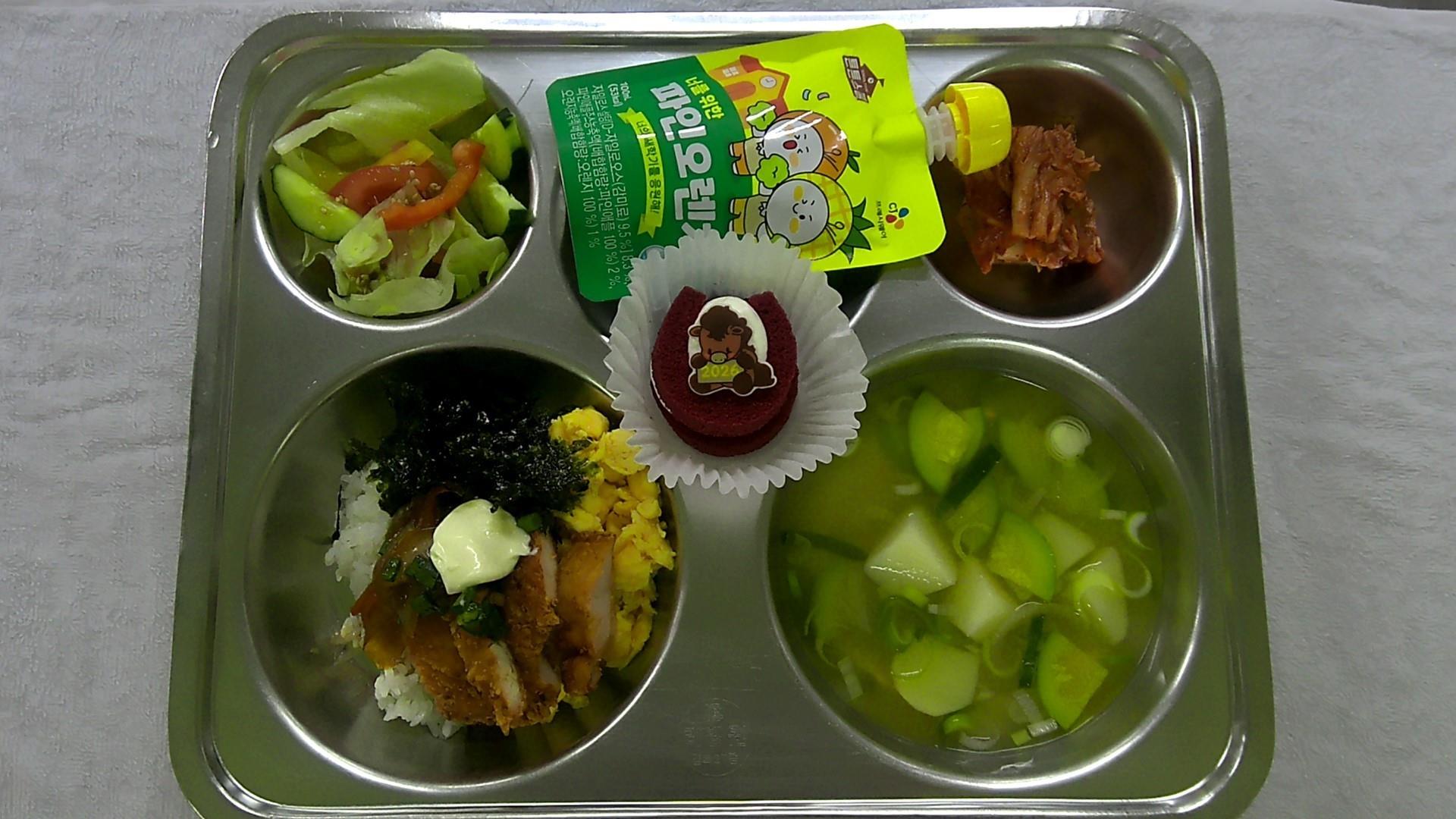 치킨마요덮밥1(1.5.6.13.15.18)감자맑은국(두루3-중등)(5.6.9.18)양상추토마토샐러드/발사믹드레싱1(1.2.5.6.12)배추김치.(9)(입학축하)마시멜로케익(1.2.5.6)파인오렌지 음료.(13)