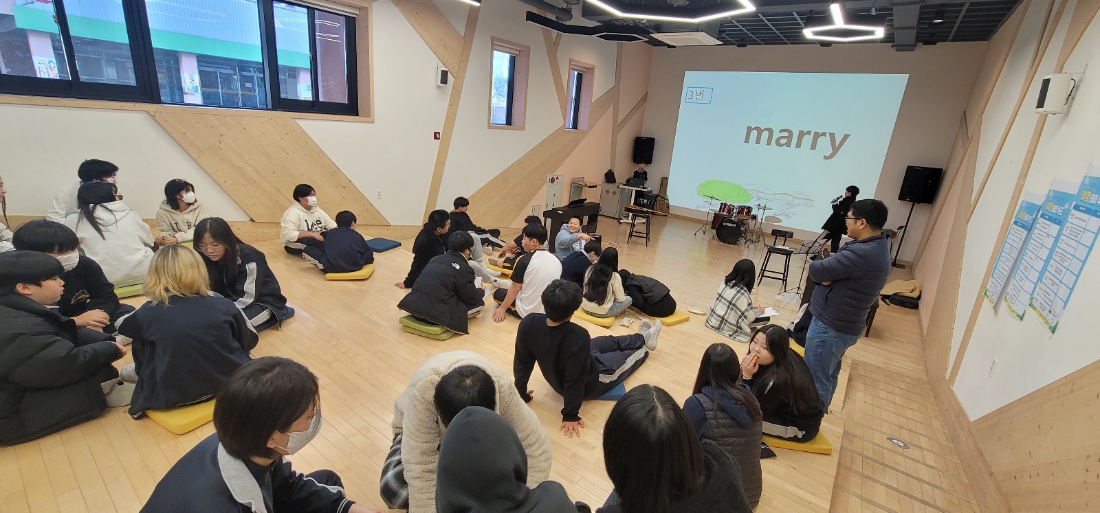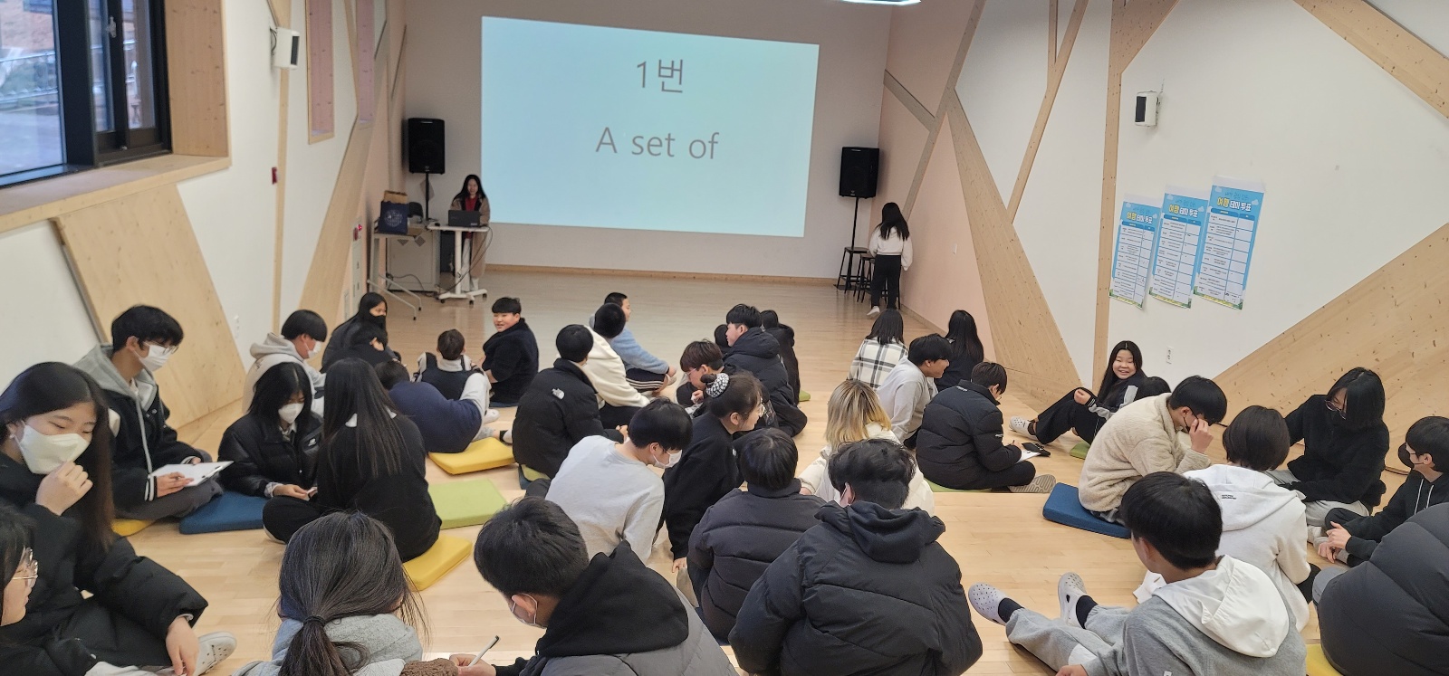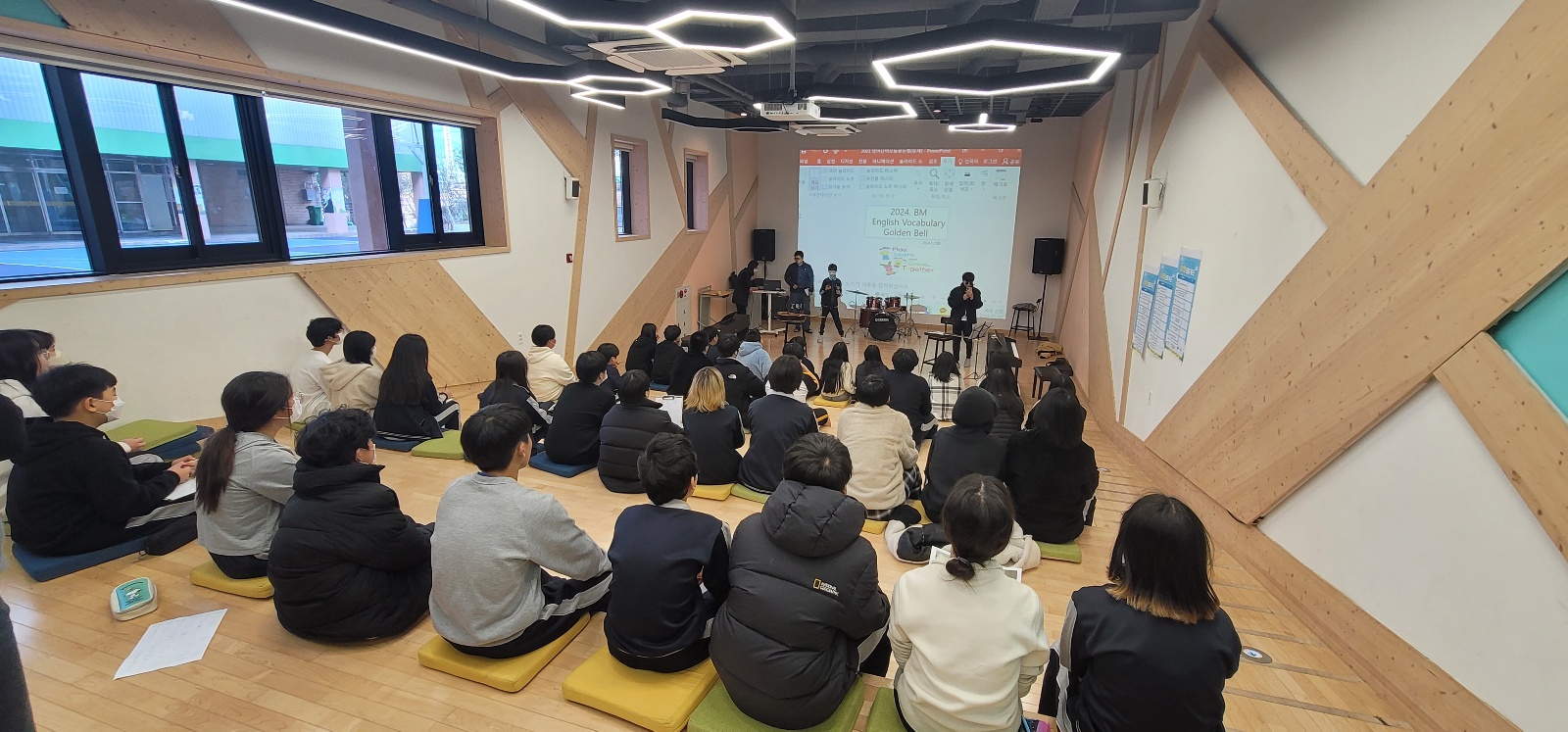 -영어로 1학년 학생들이 진행을 보며, 영어 단어 골든벨, 댄스, 밴드 공연