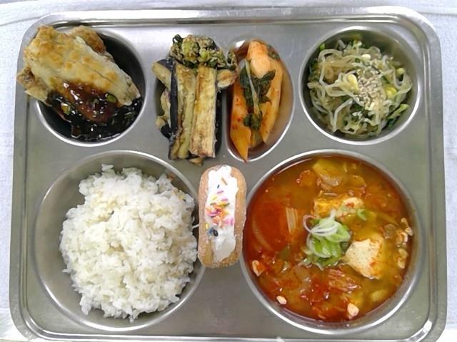 발아현미밥1순두부찌개1(5.6.9.10)삼치순살/데리야끼소스1(5.6.13)콩나물잡채.(5.6.13)가지오븐구이(자율).(5.6.13)총각김치1(9)우리밀생크림오믈렛.(1.2.5.6)