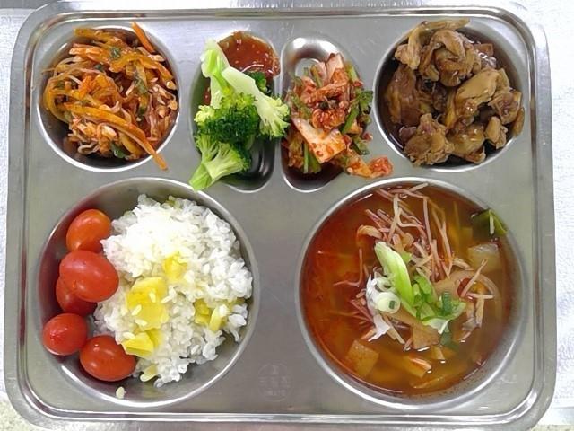 고구마밥경상도식 쇠고기국.(5.6.16)안동찜닭(순살)1(5.6.13.15.16)매콤비빔당면2(5.6.13)브로콜리/초고추장(자율).(5.6.13)배추겉절이1(13)대추방울토마토(적색)1(12)