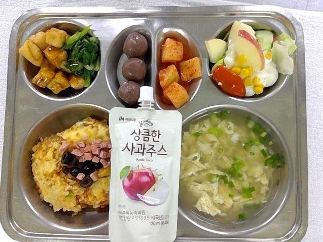 김치치즈오븐밥.(1.2.5.6.9.13.18)달걀파국.(1.5.6)두부동파육.(5.6.13.18)사과콥샐러드.(1.2.5.12.13)깍두기(자율)(9)사과주스.(13)초코떡1