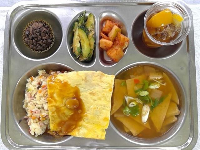 오므라이스/데미글라스소스1(1.2.5.6.10.12.13.15.16)얼큰어묵국1(1.5.6.9.18)오이쑥갓무침(자율)(5.6.13)깍두기1(9)복숭아아이스티(황도)(11.13)우리밀초코머핀(수제).(1.2.5.6)