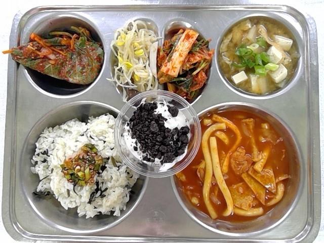 곤드레밥/양념장.(5.6.13)유부장국(소량).(5.6.9)수제깻잎김치(자율).(5.6.13)새송이콩나물무침1(5.6)국물떡볶이1(1.5.6.13)배추겉절이1(13)수제돼지바요거트.(1.2.5.6.13)