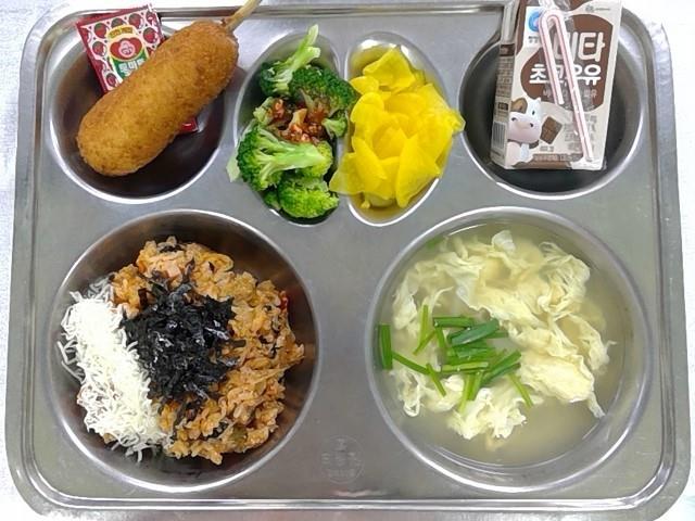 날치알김치볶음밥/눈꽃치즈1(1.2.5.6.9.10.15.16)부추달걀국1(1.9.13)브로콜리/초고추장(자율).(5.6.13)꼬들단무지크리스피 반반핫도그.(1.2.5.6.10.12.15.18)미니초코우유.(2)
