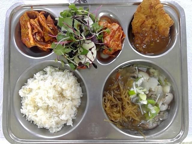 찰현미밥2한우버섯전골1(5.6.16.18)충무식오징어어묵무침1(1.5.6.13.17)카프레제샐러드1(2.12.13)수제치킨까스1(1.2.5.6.12.13.15.16.18)배추김치2(9)