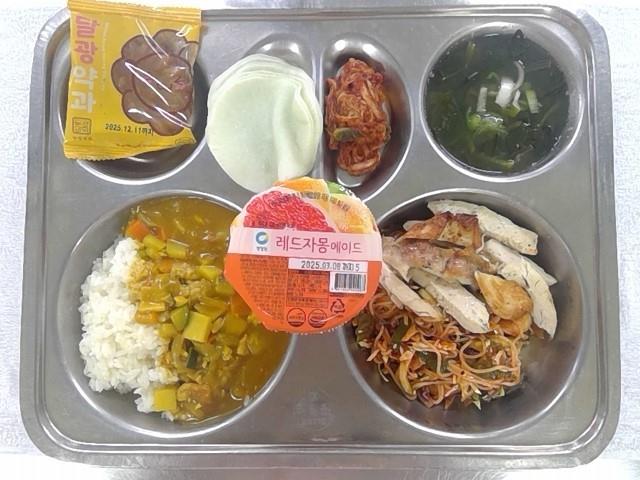 우리쌀카레라이스1(2.5.6.13.15.16.18)시금치된장국1(소량)(5.6.9)치킨구이&달콤비빔면.(5.6.13.15)배추김치2(9)약과(1.5.6)레드자몽에이드.무쌈(자율)