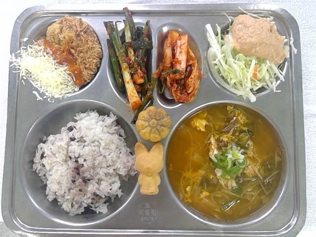 검정쌀밥2뽀로로붕어빵&미니국화빵1(1.2.5.6)쇠고기육개장1(1.16)고소한양배추샐러드.(1.5.12.13)배추겉절이2(13)파김치(자율).로제돈까스/눈꽃치즈1(1.2.5.6.10.12.13)
