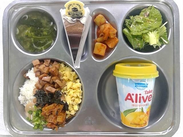 스팸김치마요덮밥1(1.2.5.6.9.10.13.15.16)아욱국(자율)1(5.6.9)봄동겉절이(달래)1(5.6.13)깍두기1(9)(졸업축하)우리밀초코케익(1.2.5.6)망고쥬스2(13)