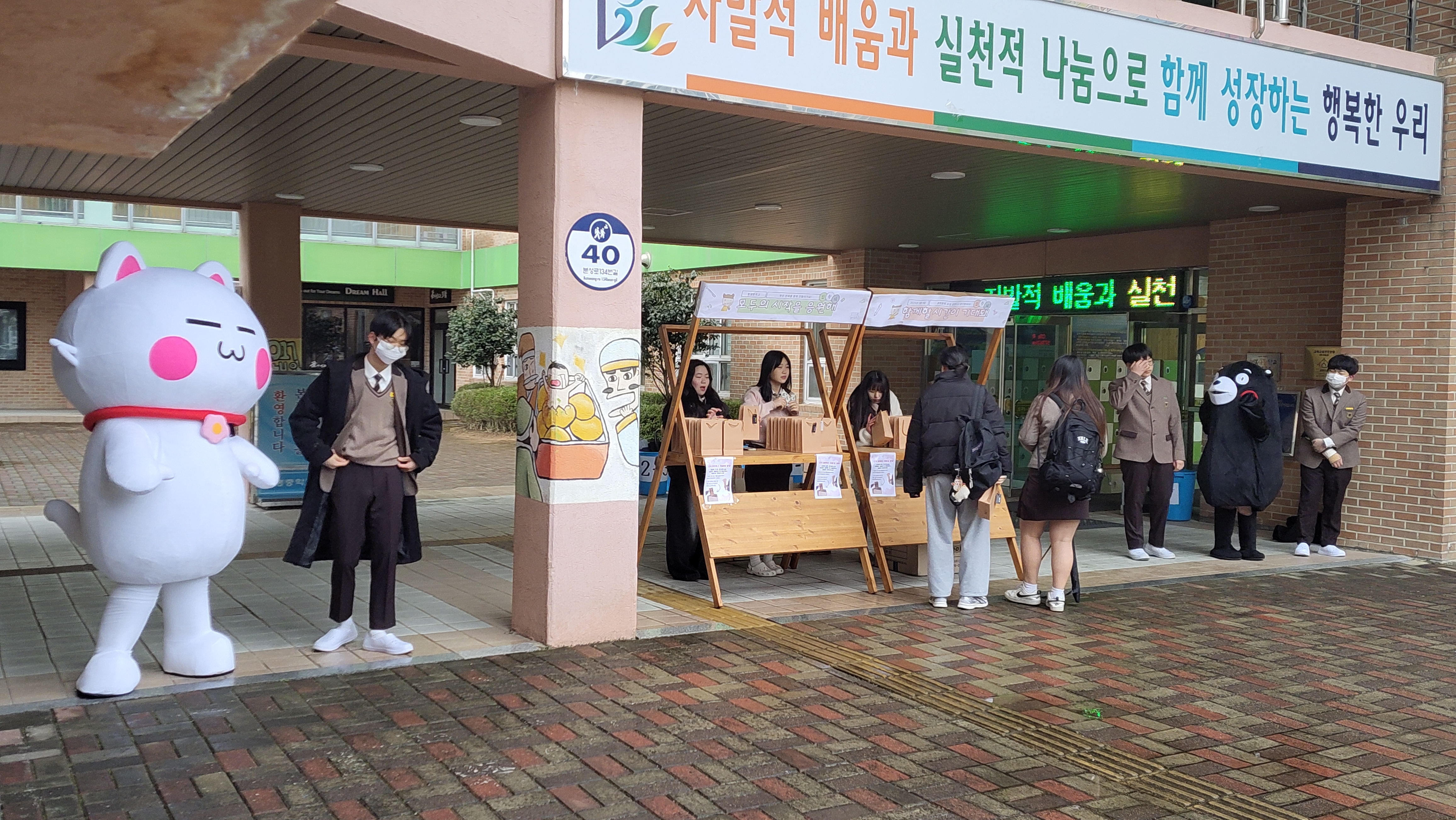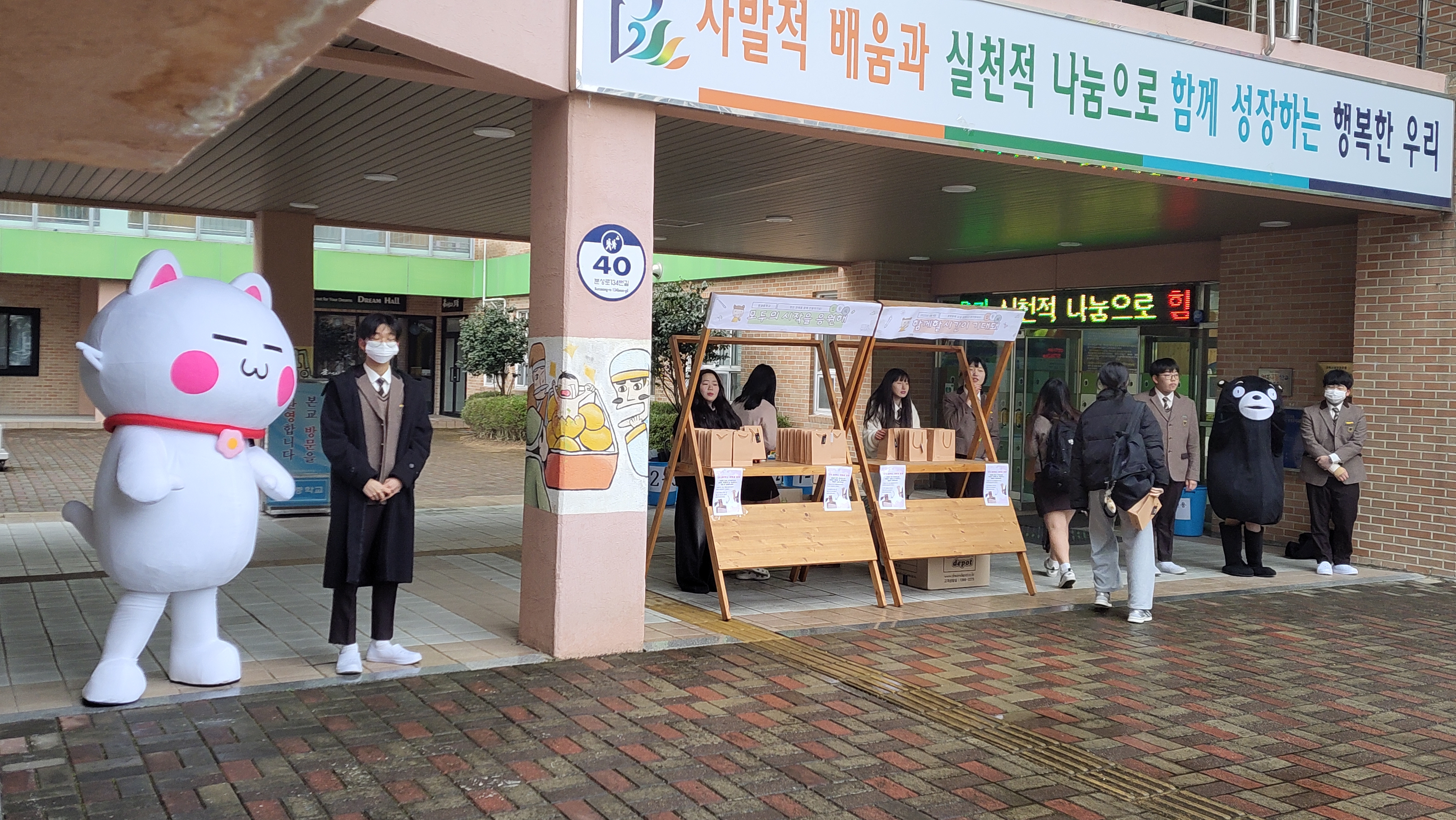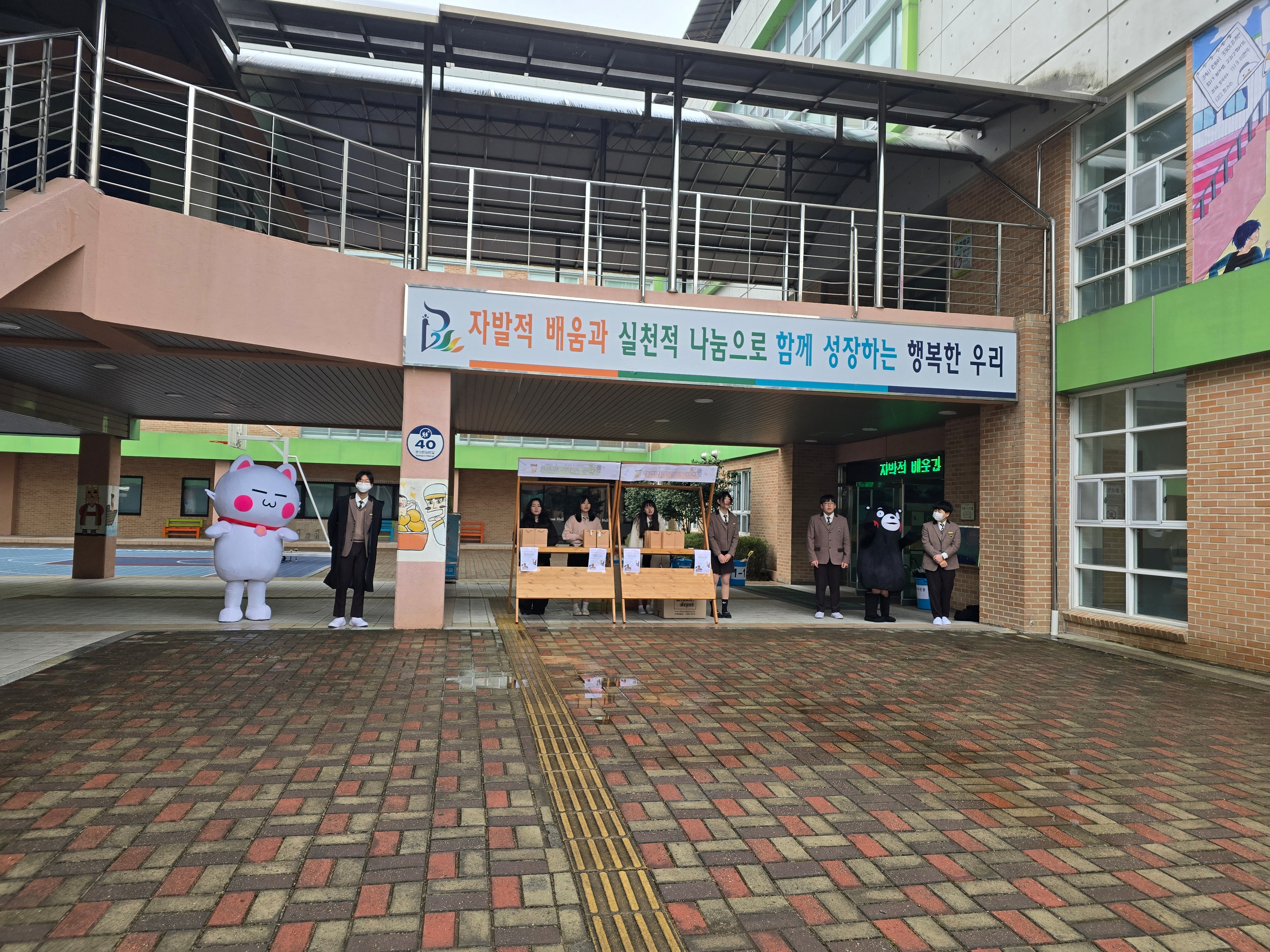 봉명중 구성원들이 새학년을 행복하고 편안하게 시작할 수 있도록 함. (재활용 간식 박스, 신입생 미션 임파서블, 귀여운 동물 탈 인사 등)