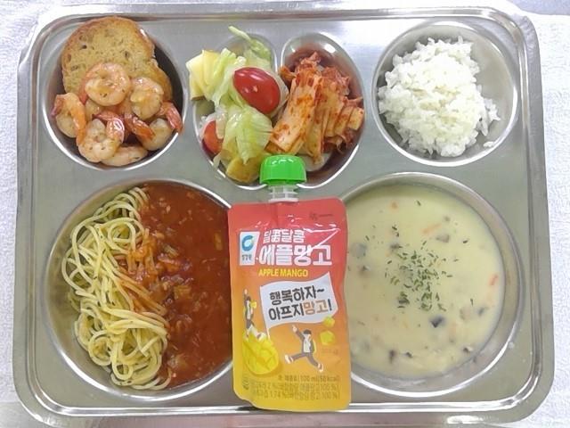흰쌀밥(자율)1양송이크림스프1(2.5.6.13.16)양상추사과샐러드(자율).(1.2.5.6.12)감바스/마늘빵1(2.5.6.9.13)스파게티(주.채식)1(1.2.5.6.12.13)배추김치2(9)쥬스(애플망고)1(13)