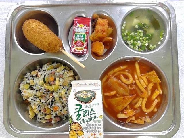 김밥볶음밥1(1.2.5.6.10.13.15.16)미소된장국(자율)1(5.6.9)국물떡볶이1(1.5.6.13)크리스피 반반핫도그.(1.2.5.6.10.12.15.18)깍두기2(9)유산균음료(파인애플맛).(2)
