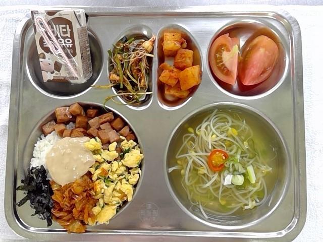 스팸김치마요덮밥1(1.2.5.6.9.10.13.15.16)맑은콩나물국1(5.6.9)달래오이무침(자율).(5.6.13)깍두기2(9)꿀뿌린토마토1(12)미니초코우유.(2)