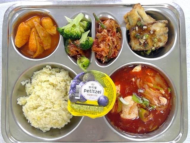루테인쌀밥.짬뽕순두부찌개1(5.6.9.13.17.18)삼치순살/데리야끼소스1(5.6.13)브로콜리/초고추장(자율).(5.6.13)치즈떡볶이1(1.2.5.6.13)배추겉절이2(13)포도푸딩1