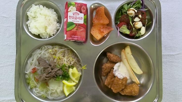 흰쌀밥(자율)1양지쌀국수1(5.6.15.16.18)카프레제샐러드(방울토마토)1(1.2.5.6.12.13)스윗 순살치킨.(1.2.5.6.15)석박지2(9)사과주스.(13)