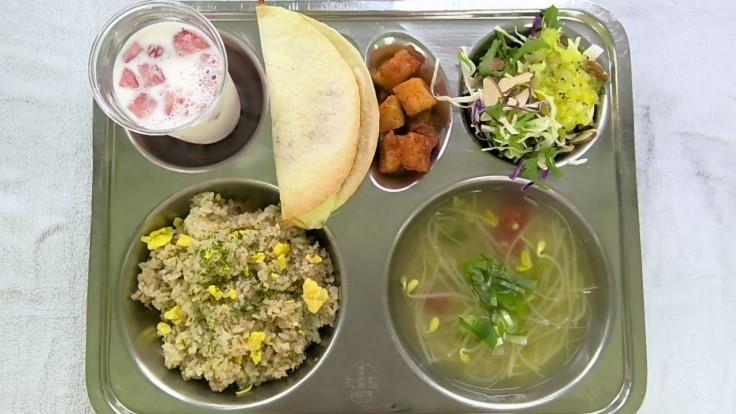 참치알리올리오볶음밥(1.5.6.13.18)맑은콩나물국1(5.6.9)채소샐러드/키위소스1(11.13)김치퀘사디아.(2.5.6.9.12.13)깍두기2(9)딸기청라떼1(2.13)