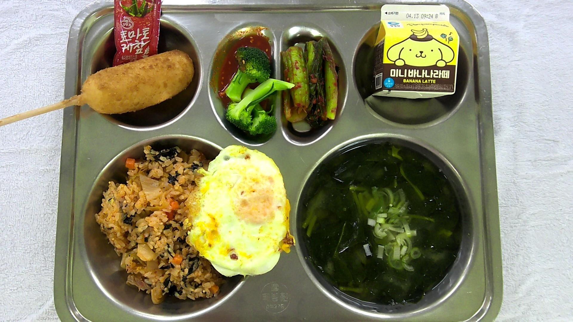 날치알김치볶음밥1(다채롭)(5.9.13)시금치된장국1(5.6.9)브로콜리/초고추장(자율).(5.6.13)달걀후라이1(1.5)갓김치2(9)치즈크리스피핫도그(채식).(1.2.5.6.10.12.16)미니바나나우유1(2)