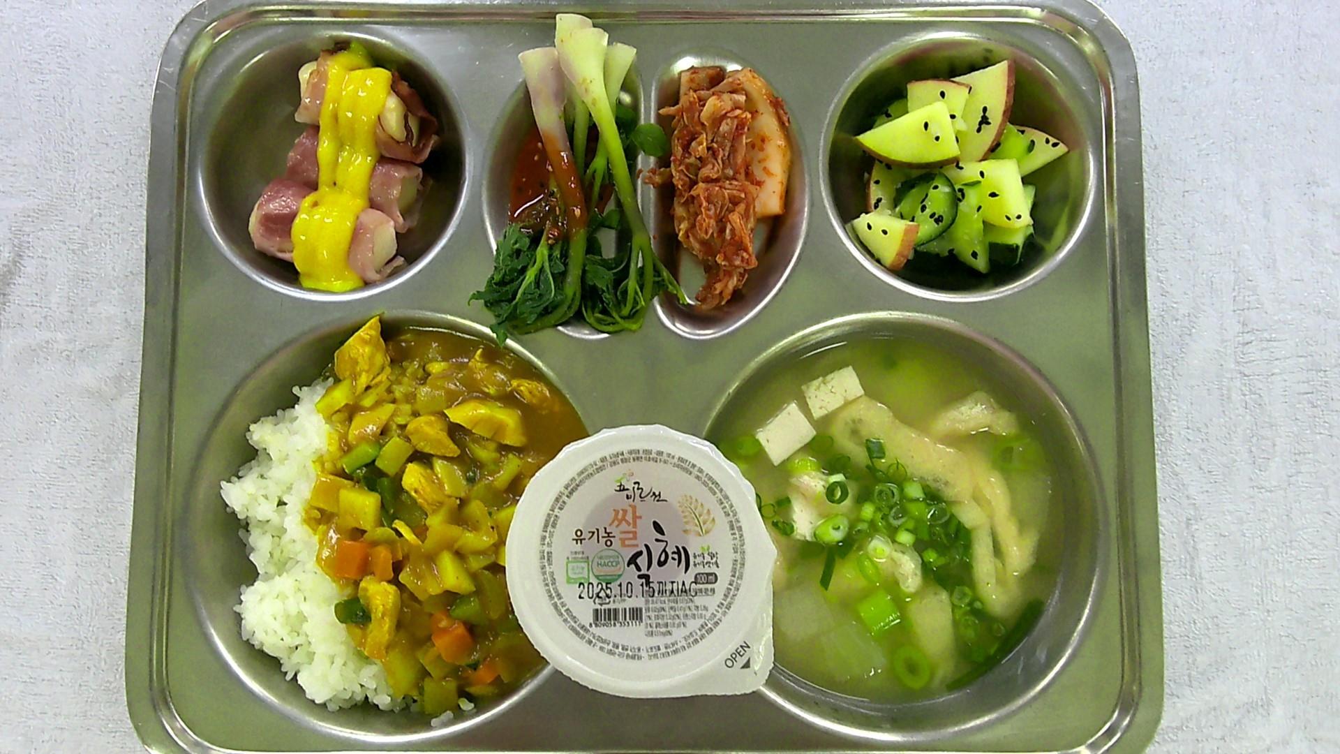 우리쌀카레라이스1(2.5.6.13.15.16.18)유부장국1(5.6.9)두릅/초고추장(자율)(5.6.13)사과오이초무침1(13)가래떡베이컨말이1(1.5.6.10.13)배추김치2(9)유기농쌀식혜1