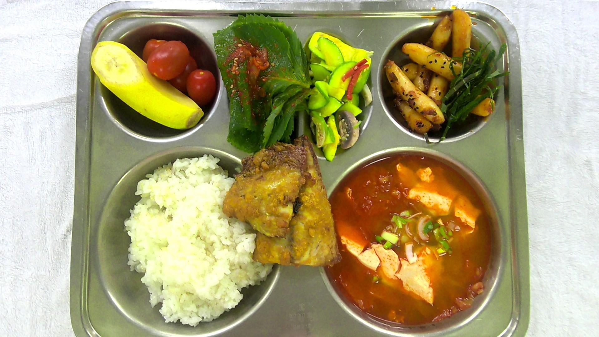 찰현미밥1순두부찌개1(5.6.9.10)수제깻잎김치1(5.6.13)애호박버섯볶음(자율)(5.9)기름떡볶이1(5.6.13)고등어카레구이1(2.5.6.7.12.13.16.18)바나나+대추방울토마토.(12)