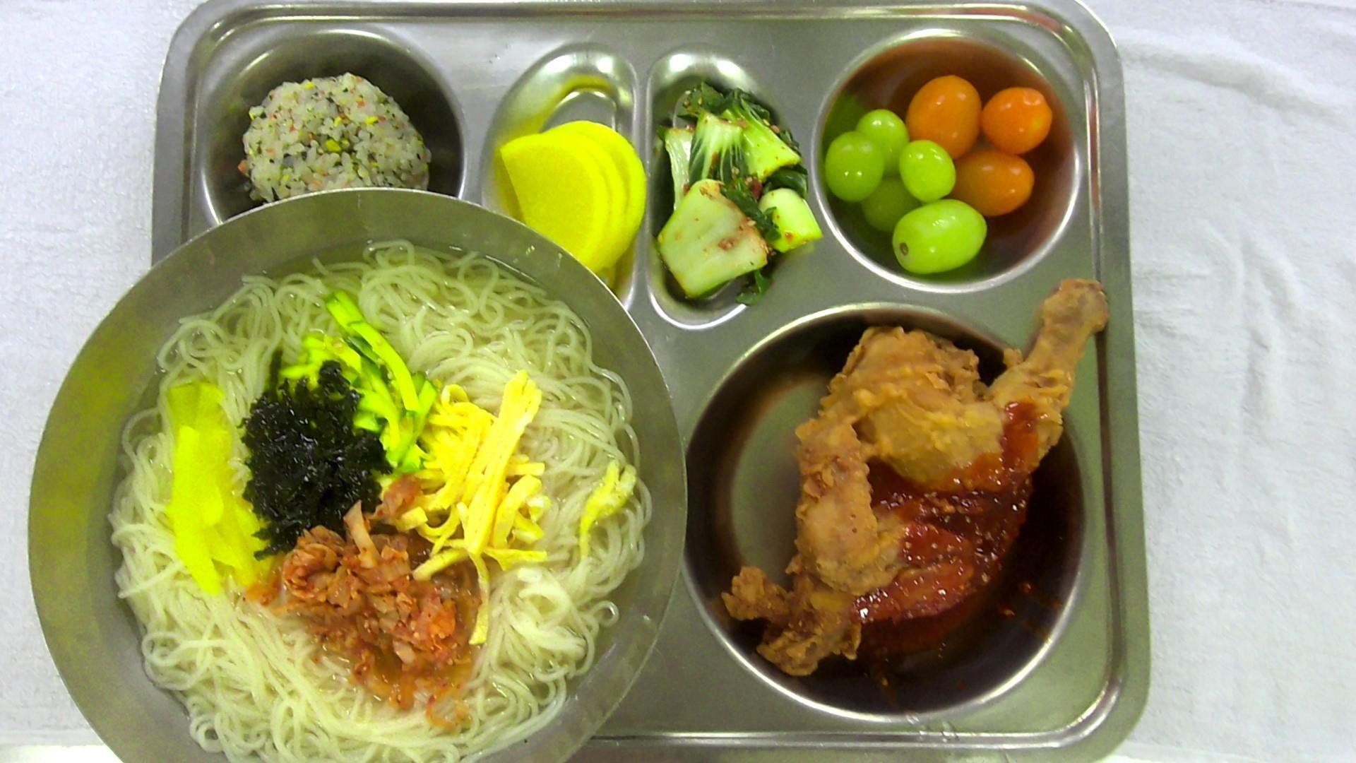 후리가케주먹밥.(1.2.5.6.9.13.16.18)김치말이물국수(생면)1(1.5.6.9)청경채겉절이(자율)(5.6.13)단무지1반마리 치킨1(2.5.6.12.13.15.18)모듬과일(대추토마토+청포도).(12)