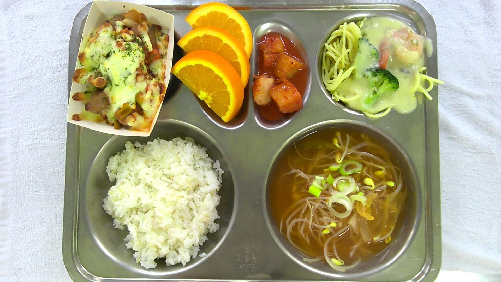 발아현미밥1김치콩나물국1(5.6.9)크림스파게티(채식)1(1.2.5.6.9.13.16)미트볼치즈그라탕(종이트레이)1(1.2.5.6.10.12.13.15.16)깍두기2(9)오렌지1