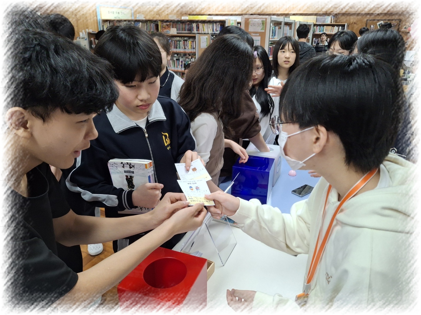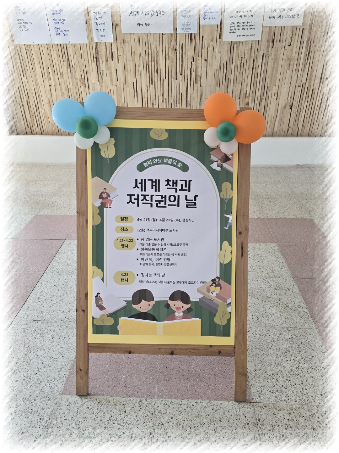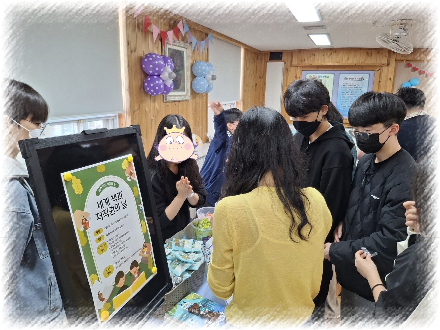 세계 책과 저작권의 날을 기념하여 독서 이벤트를 실시하였습니다. * 일시: 2025. 4. 21.(월)~4.23.(수), 점심시간 * 장소: (2층)책누리지혜마루도서관 * 대상: 전교생, 교직원 * 프로그램 - 꽝 없는 도서관(책 대출권수만큼 사탕&초콜릿 증정, 퀴즈행운뽑기) - 알쏭달쏭 북티콘(이모티콘과 힌트를 이용하여 책 제목 찾기) - 이런 책, 이런 인형(다문화 도서&인형과 인증샷찍기) - 정 나눔 책의 날(4.23 책을 대출하는 모두에게 초코파이 증정)