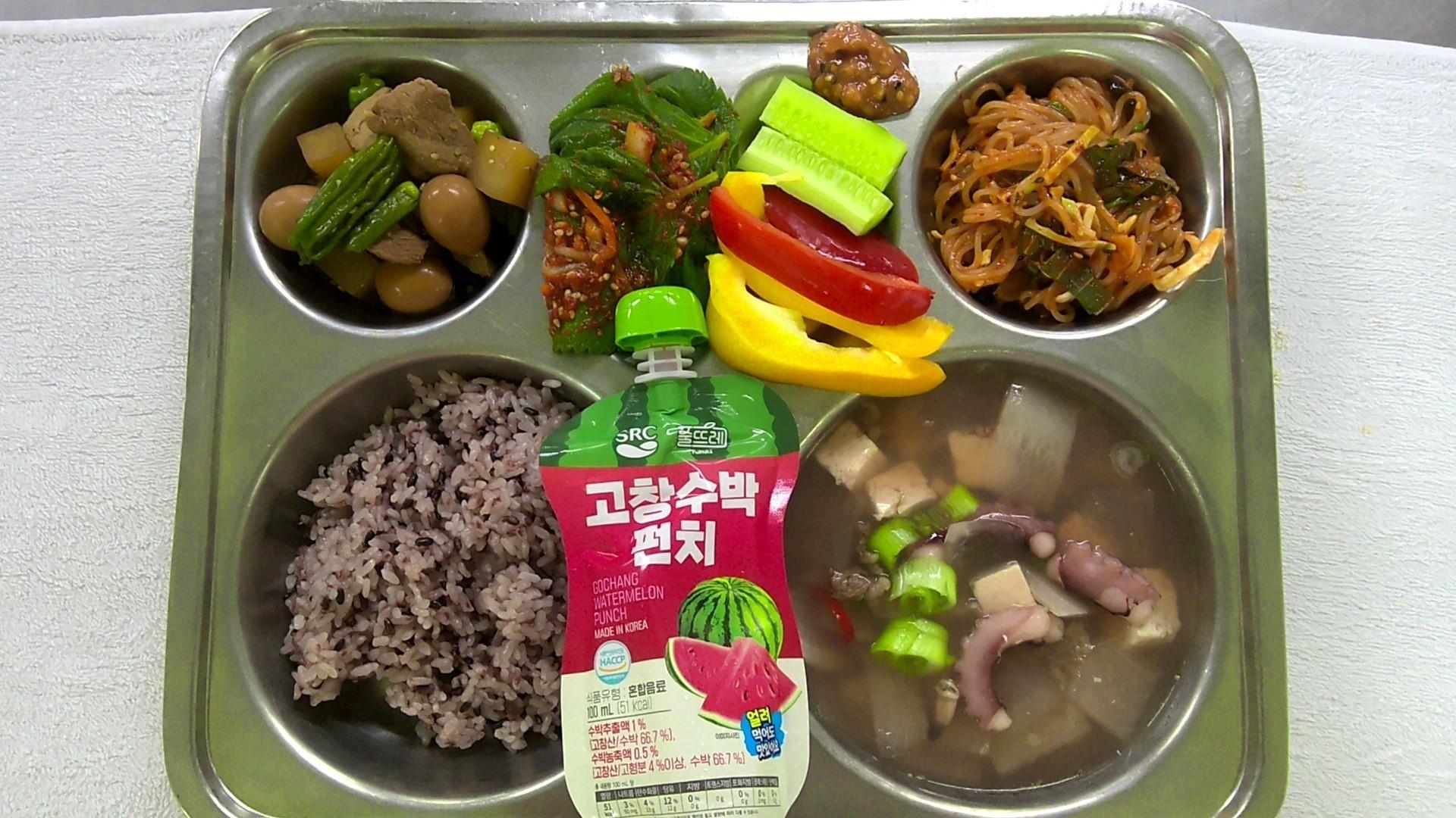 검정쌀밥1쫄면야채무침1(5.6.13)연포탕1(5.16.18)돈육곤약메추리알장조림1(1.5.6.10.13.16)수제깻잎김치2(5.6.13)수박펀치.(13)오이&파프리카 스틱/쌈장2(5.6)