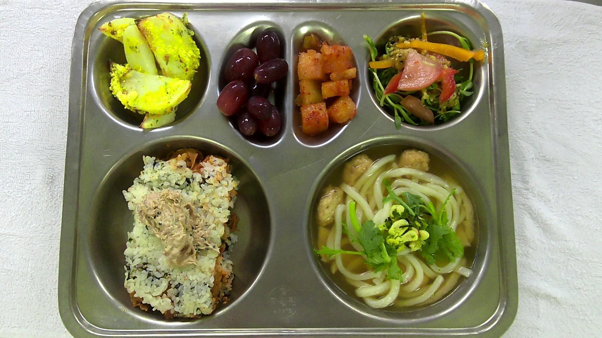 밥버거(열탄불고기)1(1.5.6.16.18)미니우동1(1.2.5.6.7.9.18)돌나물샐러드(자율)(5.6.12.13.14.18)콘소메수제웨지감자(2.5.6.13.16)깍두기2(9)씨없는포도1