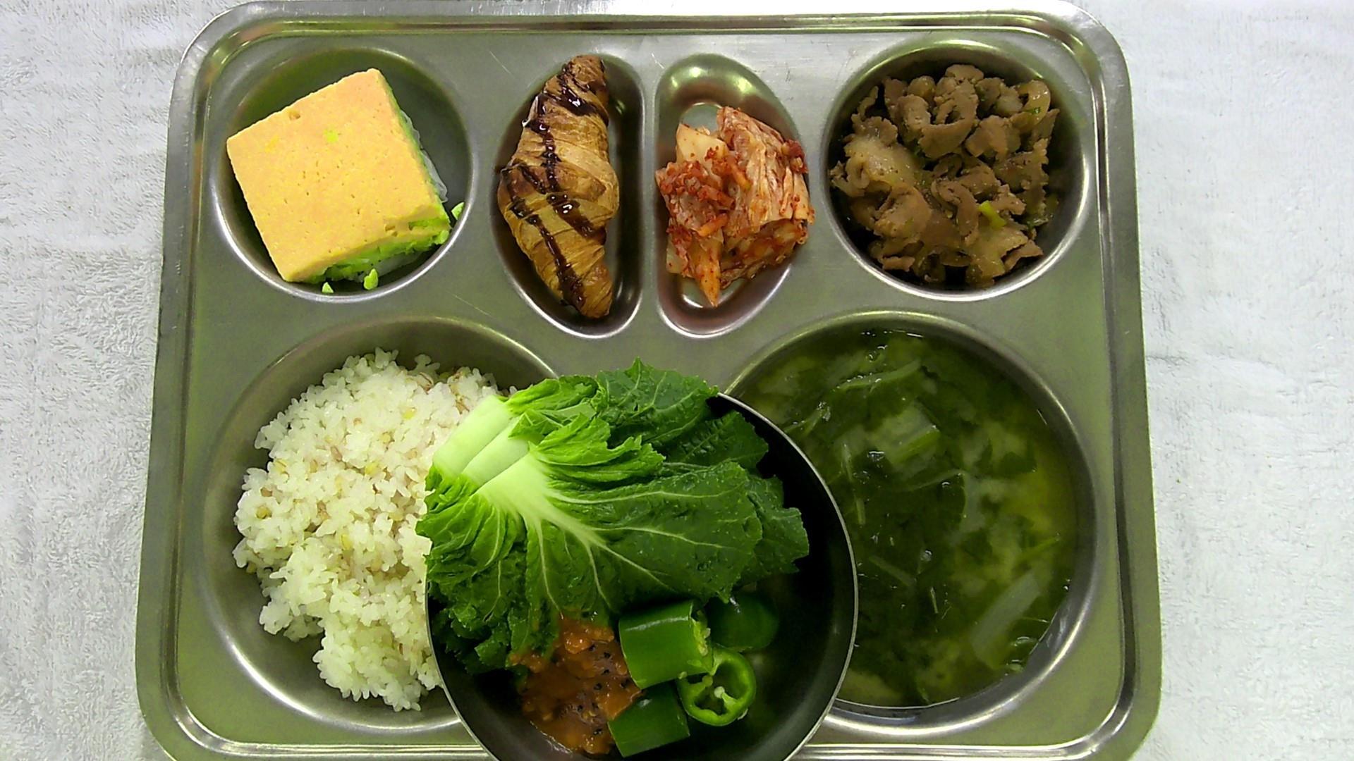 찰보리밥1미니크로와상/초코시럽1(1.2.5.6.13)근대된장국1(5.6.9)이색계란찜.(1.2.9)돈육바싹불고기1(5.6.10.13.16.18)배추김치2(9)쌈추+고추1(자율)