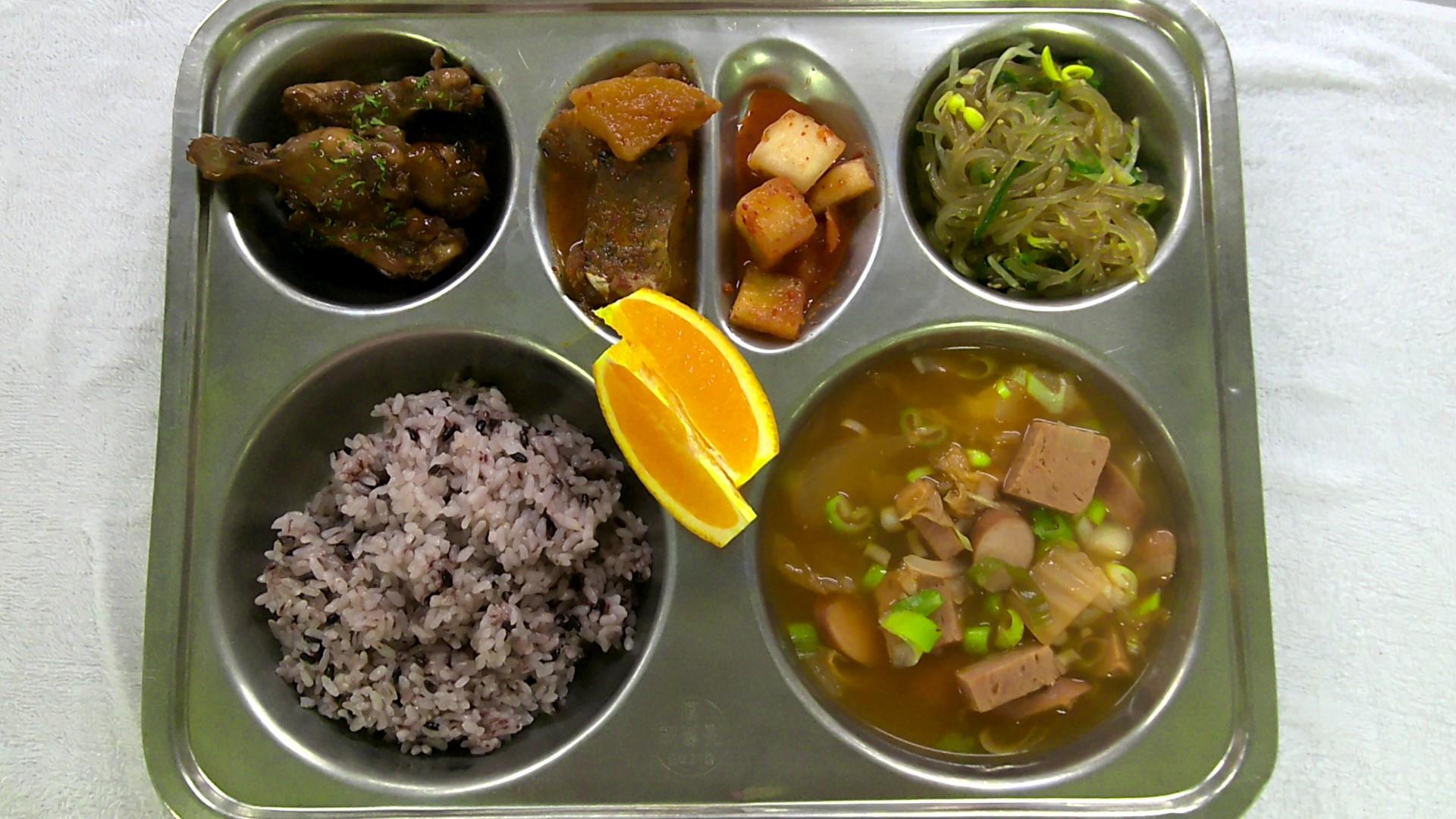 검정쌀밥1부대찌개(슬라이스)1(1.2.5.6.9.10.15.16)코다리무조림(자율)(5.6.13)콩나물잡채.(5.6.13)닭봉오븐구이1(5.6.13.15.16)깍두기2(9)오렌지1