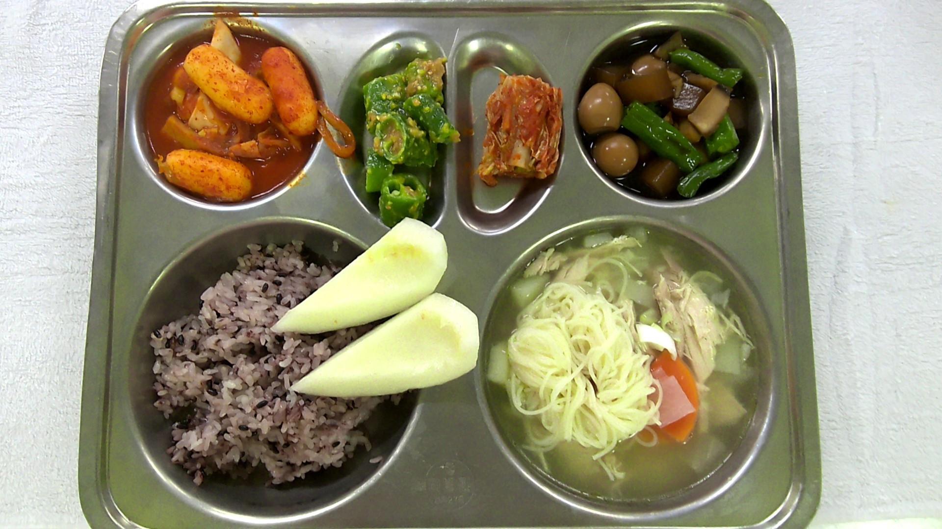 검정쌀밥1닭곰탕&소면1(5.6.15)모듬장조림(곤약/메추리/버섯)1(1.5.6.13.16)치즈떡볶이1(1.2.5.6.13)배추김치2(9)참외1오이고추된장무침(자율).(5.6)