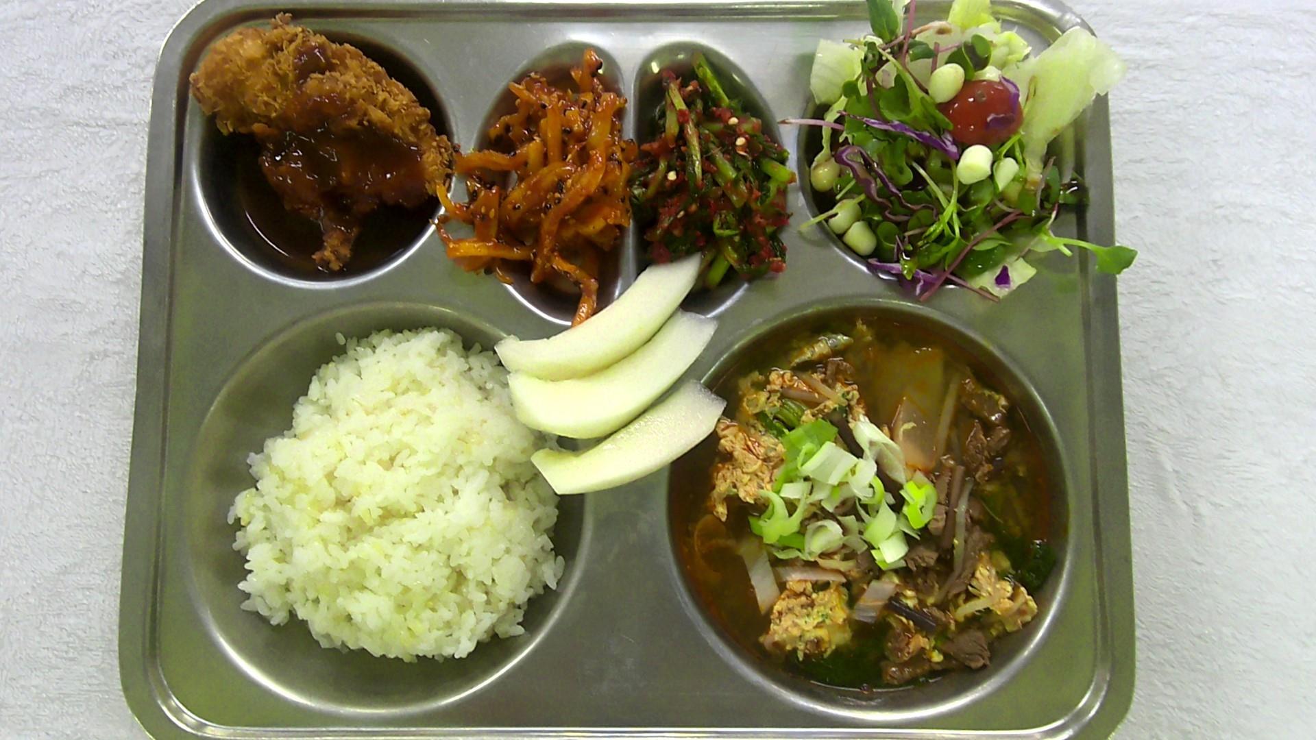 찰현미밥1쇠고기육개장1(1.16)카프레제샐러드(방울토마토)1(1.2.5.6.12.13)오징어채무침1(1.5.6.13.17)수제치킨까스2(1.2.5.6.12.13.15.16.18)수제 열무김치2(9)참외1