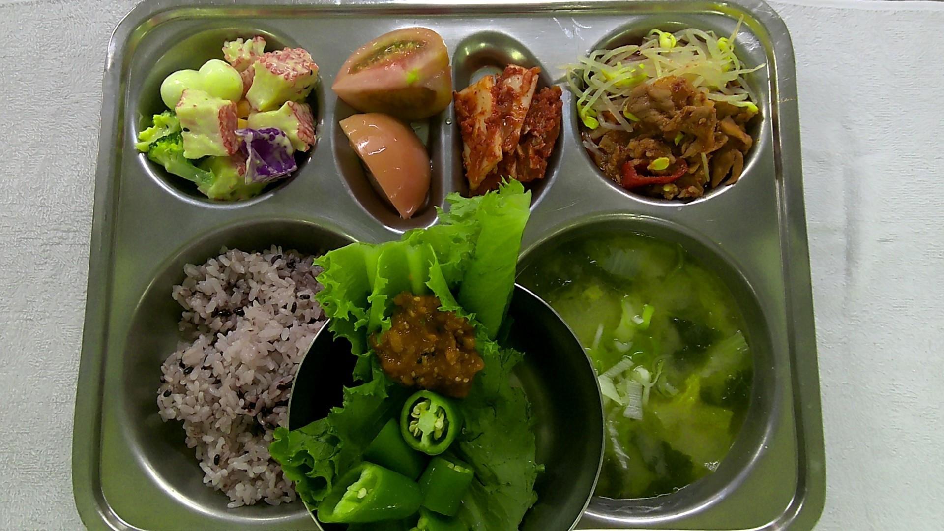 검정쌀밥1들깨시락국1(5.6.9)꽃맛살샐러드(다채).(1.2.5.6.8.18)콩나물불고기1(5.6.10.13.18)배추김치2(9)꿀뿌린토마토1(12)청상추+고추1(자율)