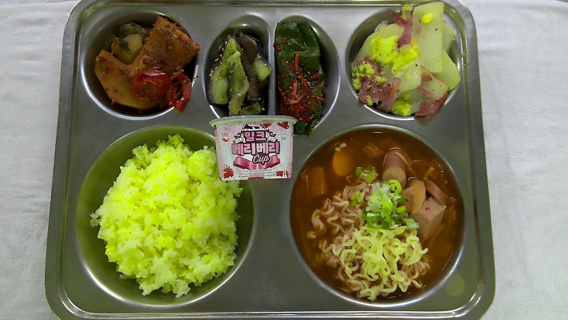 강황쌀밥1부대찌개/라면사리1(1.2.5.6.9.10.15.16)고등어무조림1(5.6.7.13)가지나물(자율)수제깻잎김치2(5.6.13)감자오븐구이1(2.5.10)아이스크림(딸기)1(1.2.5)