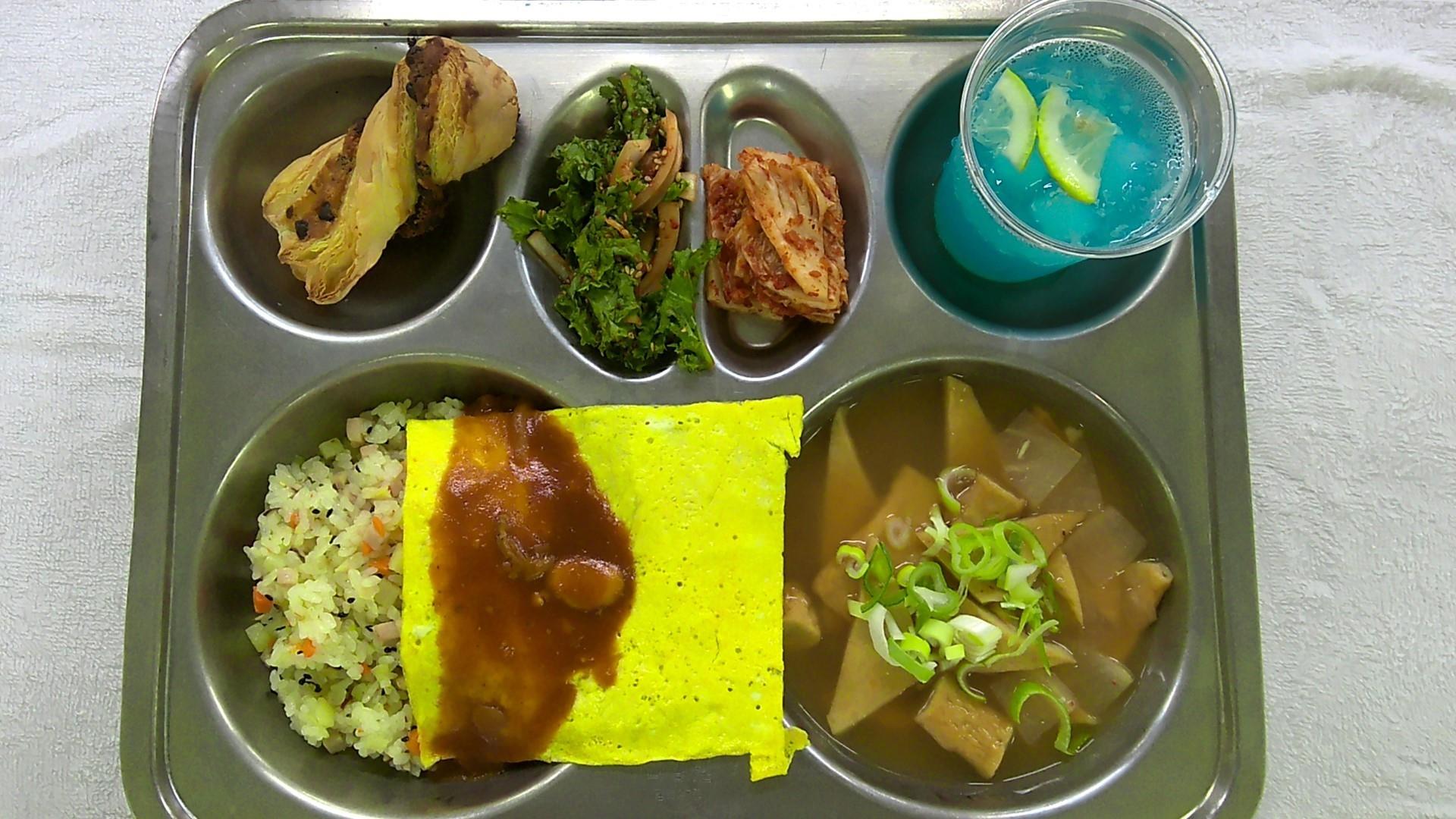 오므라이스/데미글라스소스1(1.2.5.6.10.12.13.15.16)얼큰어묵국1(1.5.6.9.18)치커리양파무침2(5.6.13)배추김치2(9)수제블루레몬에이드1(13)초코칩트위스트1(1.2.5.6)