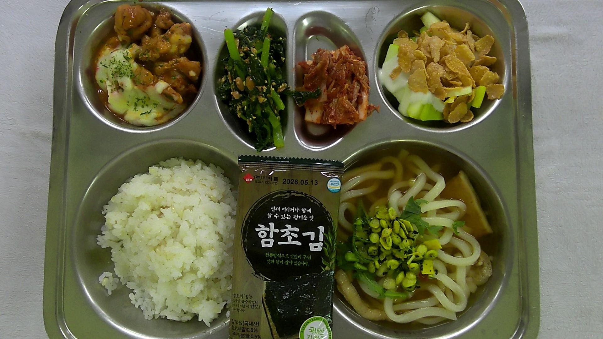 현미밥1미니우동1(1.2.5.6.7.9.18)시리얼과일샐러드1(1.2.5.6.11)치즈불닭1(2.5.6.13.15.18)배추김치2(9)함초김구이열무무침(자율).(5.6.13.18)