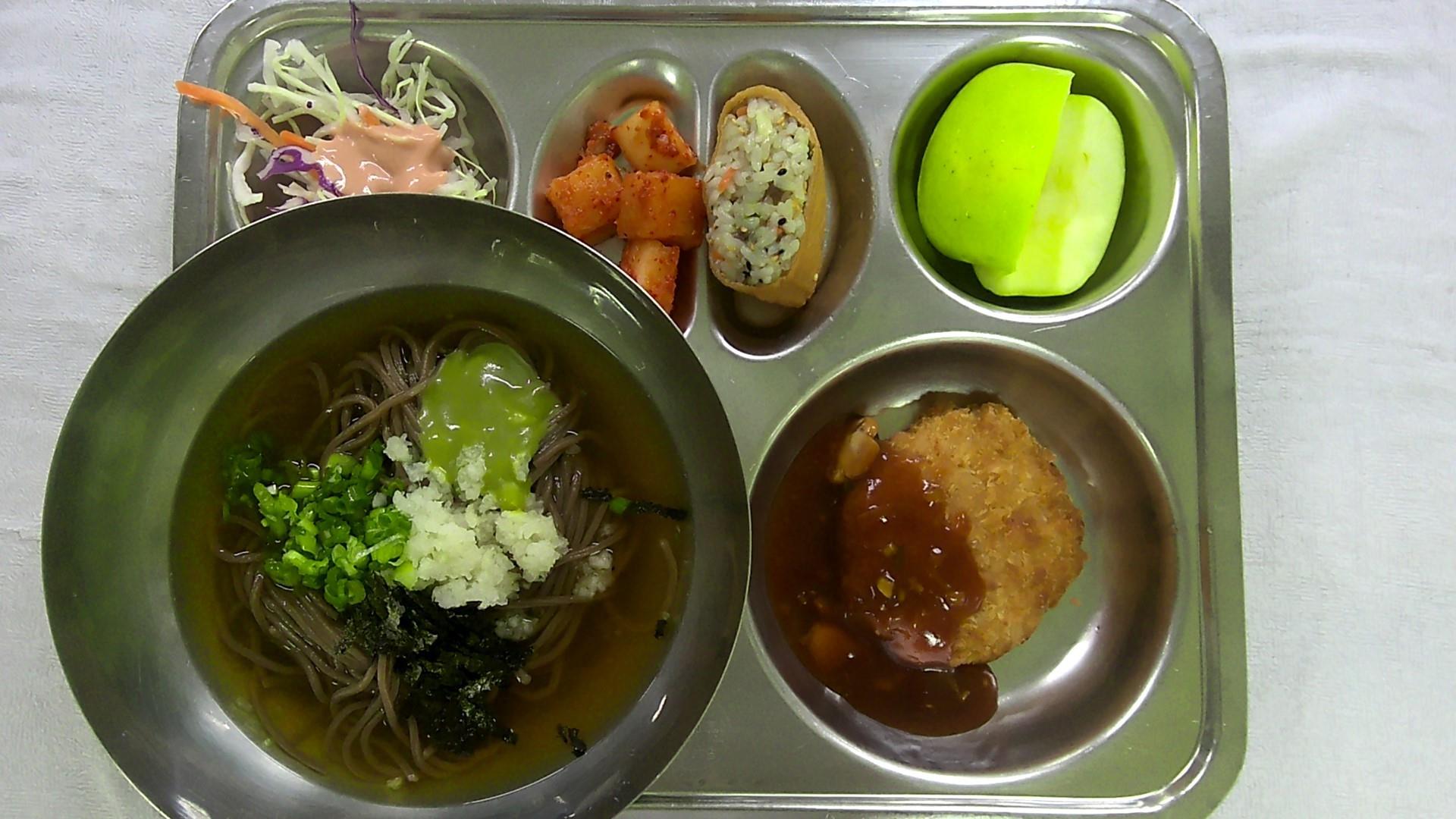 네모유부초밥(보조)1(5.6.13.16)냉메밀소바1(3.5.6.13)양배추샐러드2(1.5.12)깍두기2(9)구운 돈까스(가츠동소스).(1.5.6.10.12.13.18)사과(아오리)1