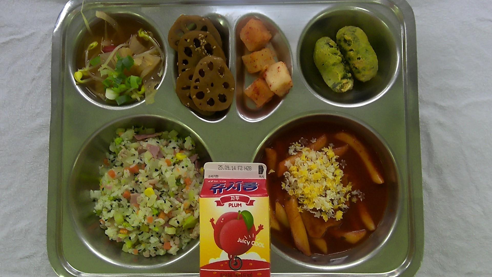베이컨브로콜리볶음밥1(5.10.13)김치콩나물국(소량)(5.6.9)연근조림2(5.6.13)별콕콕 떡볶이.(1.2.5.6.13)김말이튀김1(1.5.6.16)깍두기2(9)자두맛음료.(11.12)