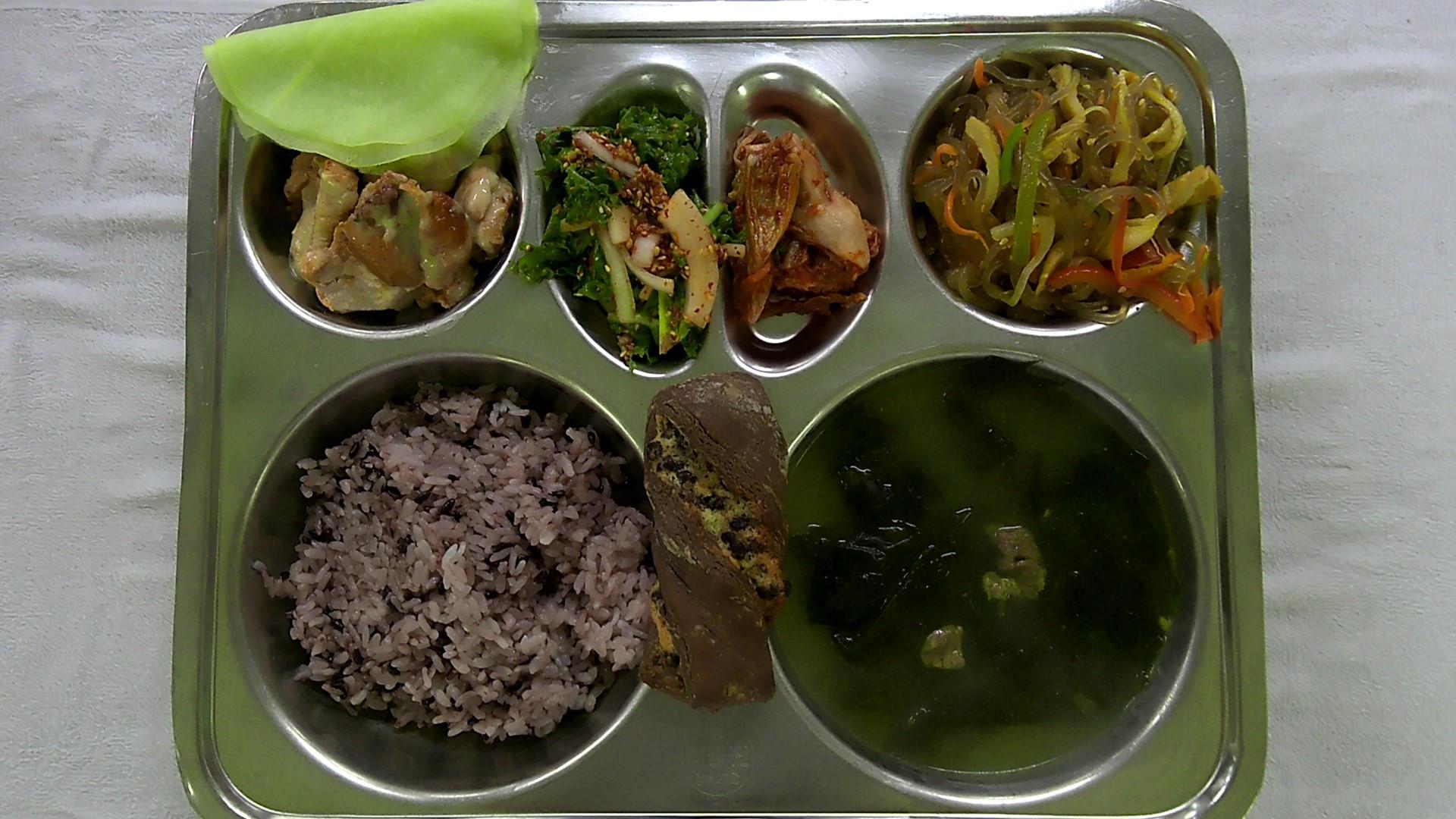 검정쌀밥2쇠고기미역국1(5.6.16)치커리양파무침2(5.6.13)어묵파프리카잡채1(1.5.6.13)오븐구이쌈닭&무쌈.(5.6.13.15.16)배추김치2(9)초코칩트위스트1(1.2.5.6)