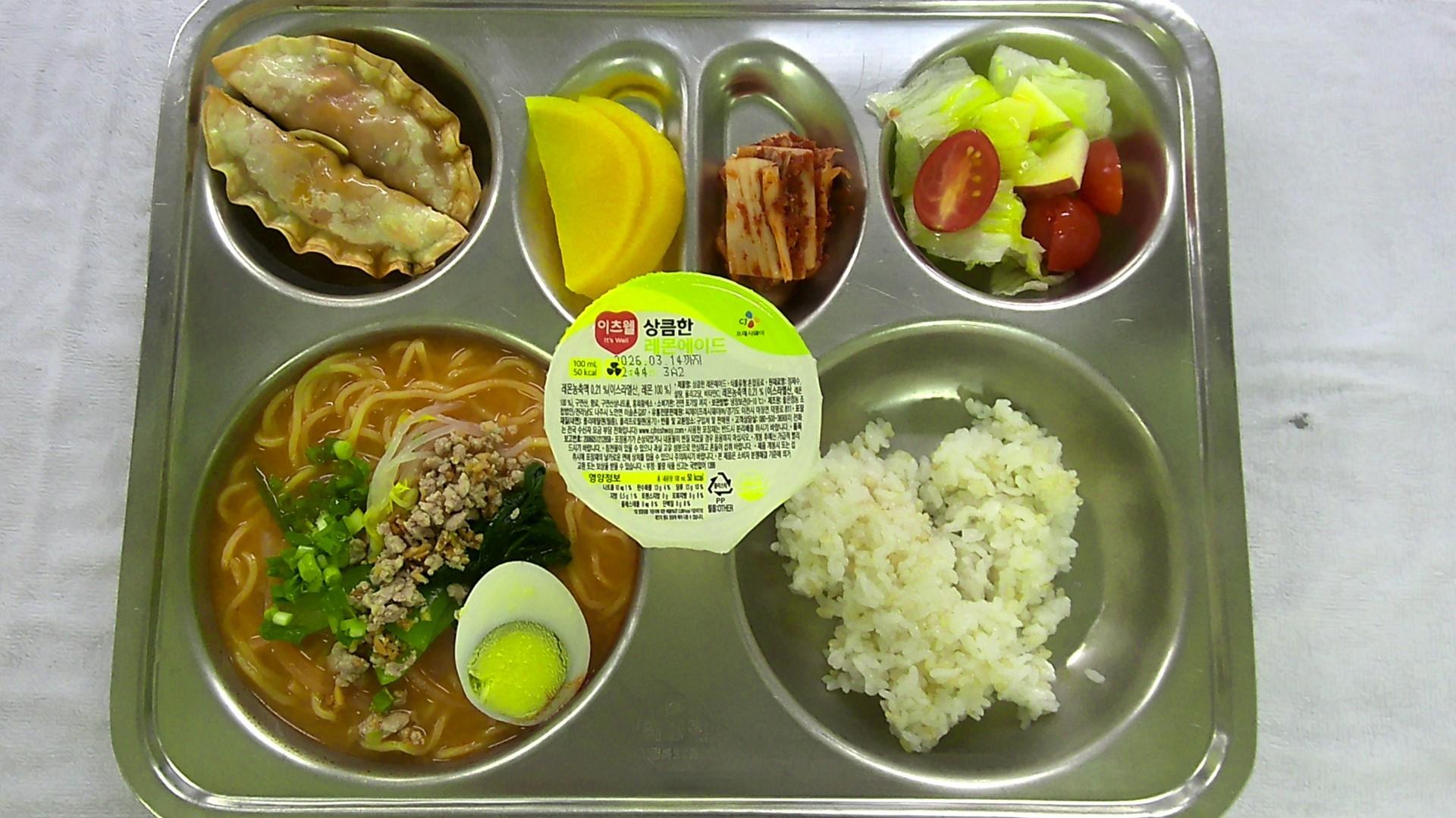 흰쌀밥(자율)2탄탄면1(1.2.4.5.6.9.10.13.15.16.17.18)단무지1양상추사과샐러드(자율).(1.2.5.6.12)배추김치2(9)김치왕교자만두(채식만두).(1.5.6.10.13.16.18)레몬에이드.
