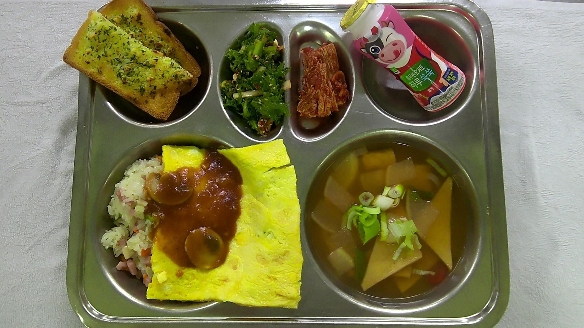 오므라이스/데미글라스소스1(1.2.5.6.10.12.13.15.16)얼큰어묵국1(1.5.6.9.18)치커리양파무침2(5.6.13)배추김치2(9)수제마늘식빵(두루9-중등)S(2.5.6)마시는요거트(베리베리)1(2)