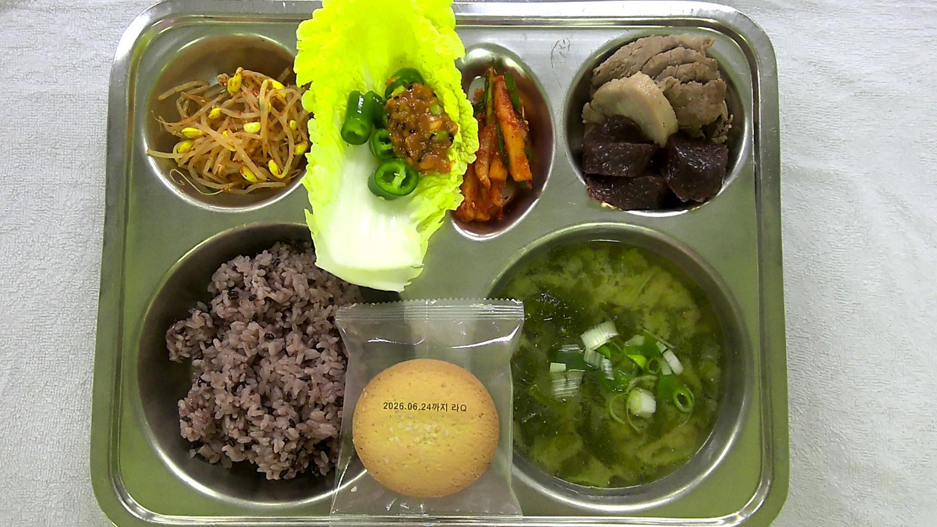 검정쌀밥2소금버터쿠키.(1.2.5.6)단배추들깨국1(5.6.9)돼지고기수육&순대1(2.5.6.10.13.16)무보쌈김치.(13)매콤콩나물무침1(5.6)알배추쌈/쌈장(자율)1(5.6)