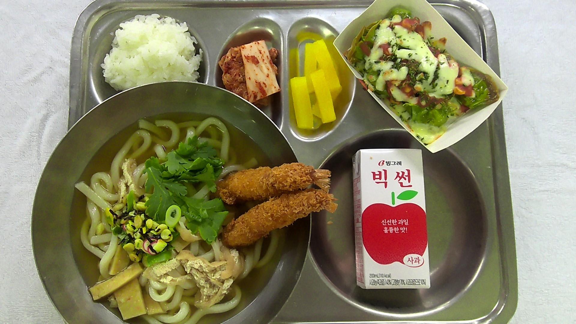 흰쌀밥(자율)2우동 & 새우튀김1(1.2.5.6.7.9.18)사각단무지1콘치즈채식만두그라탕(종이트레이)1(1.2.5.6.10.12.13.16.18)배추김치2(9)사과맛음료.(5.13)