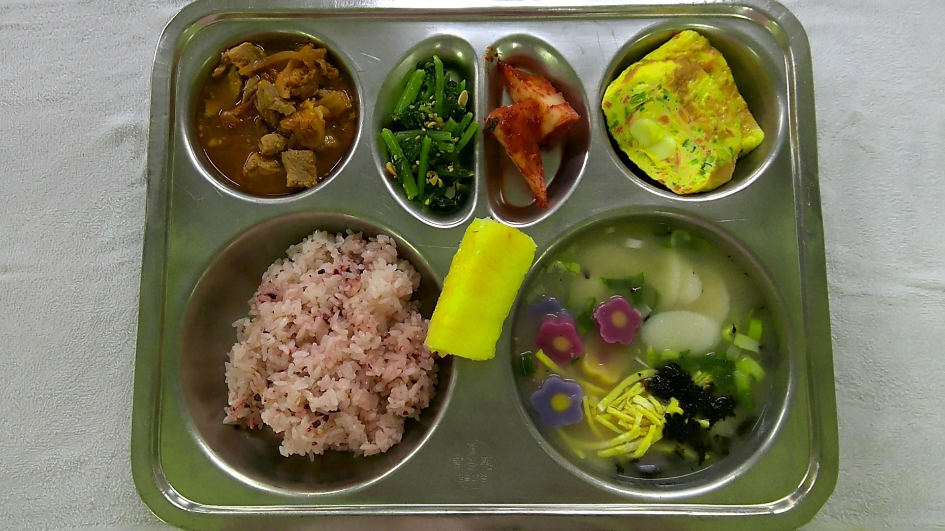 꽃씨잡곡밥1(5)꽃모양떡국.(1.5.6.9.16)돼지고기김치찜.(9.10.13)스트링치즈달걀말이1(1.2.5)총각김치2(9)골드파인애플스틱1열무무침(자율).(5.6.13.18)