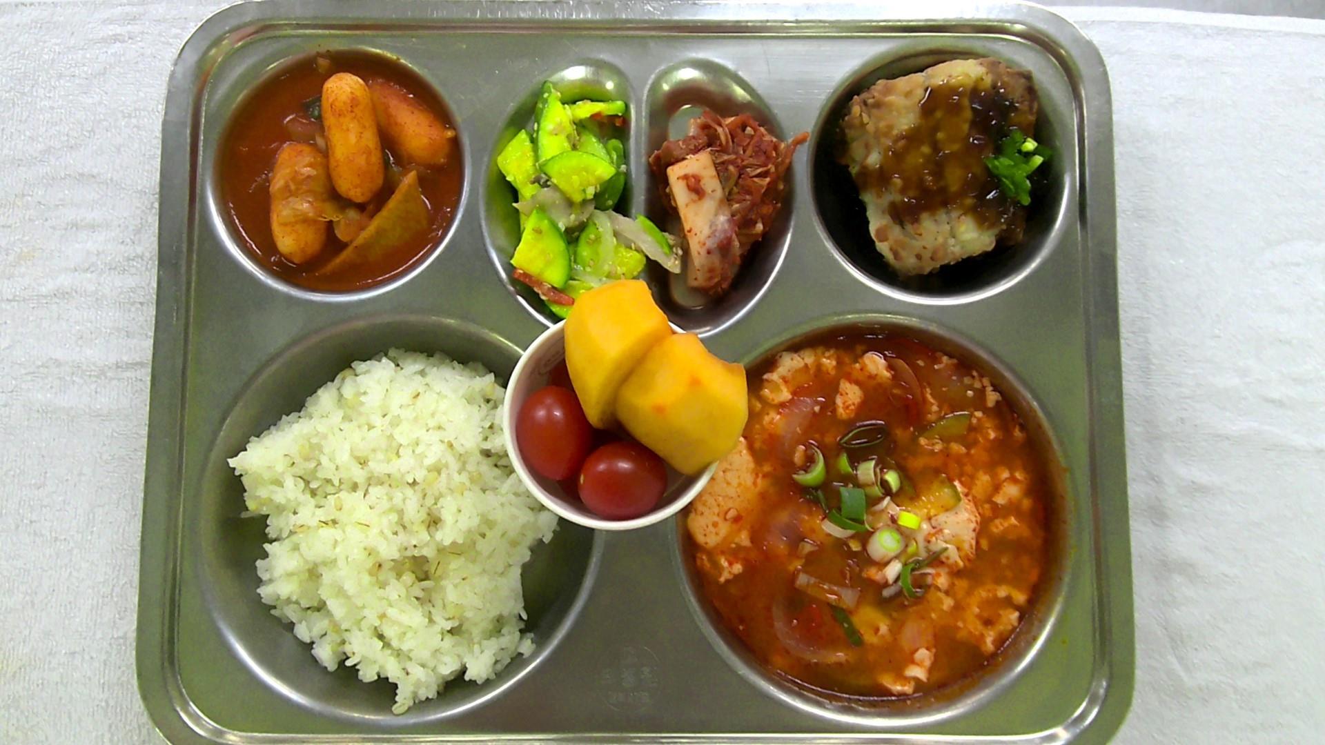 찰보리밥1짬뽕순두부찌개1(5.6.9.13.17.18)삼치순살/데리야끼소스1(5.6.13)애호박버섯볶음(자율)(5.9)치즈떡볶이1(1.2.5.6.13)배추김치2(9)모듬과일(단감,방울토마토).(12)