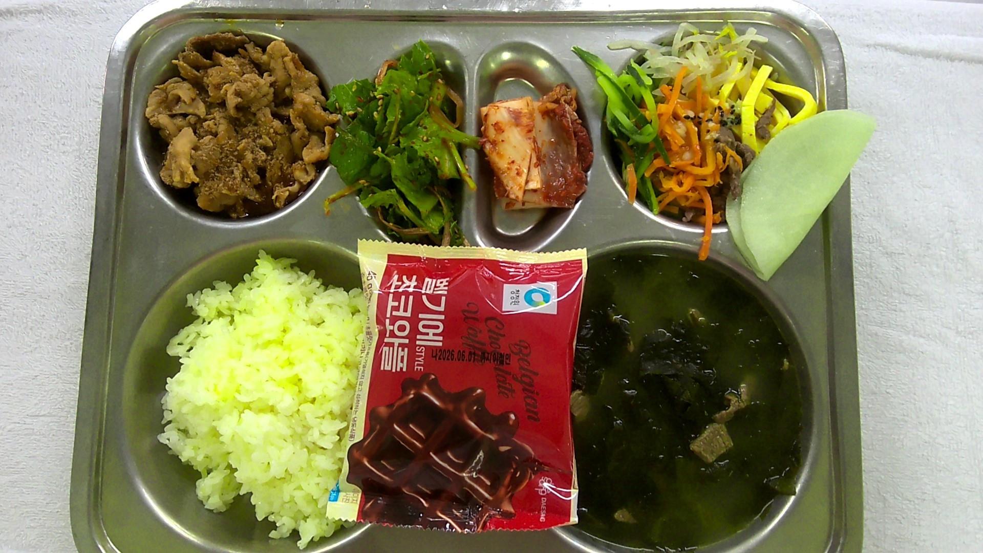 강황쌀밥1쇠고기미역국1(5.6.16)상추파채겉절이(자율)1(5.6.13)오절판+무쌈.(1.5.6.13.16)불향오븐불고기.(5.6.10.13.18)배추김치2(9)초코와플(1.2.5.6)