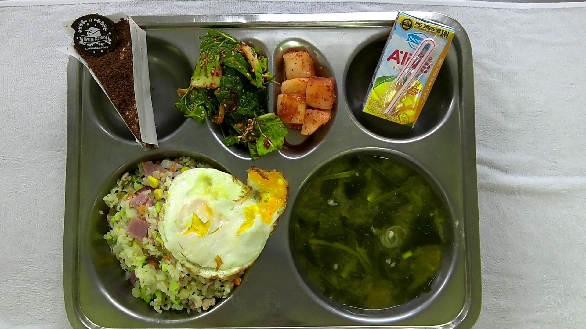 베이컨브로콜리볶음밥1(5.10.13)시금치된장국1(5.6.9)봄동겉절이(달래)1(5.6.13)달걀후라이1(1.5)깍두기2(9)(졸업축하)초코케익(1.2.5.6)망고쥬스1(13)
