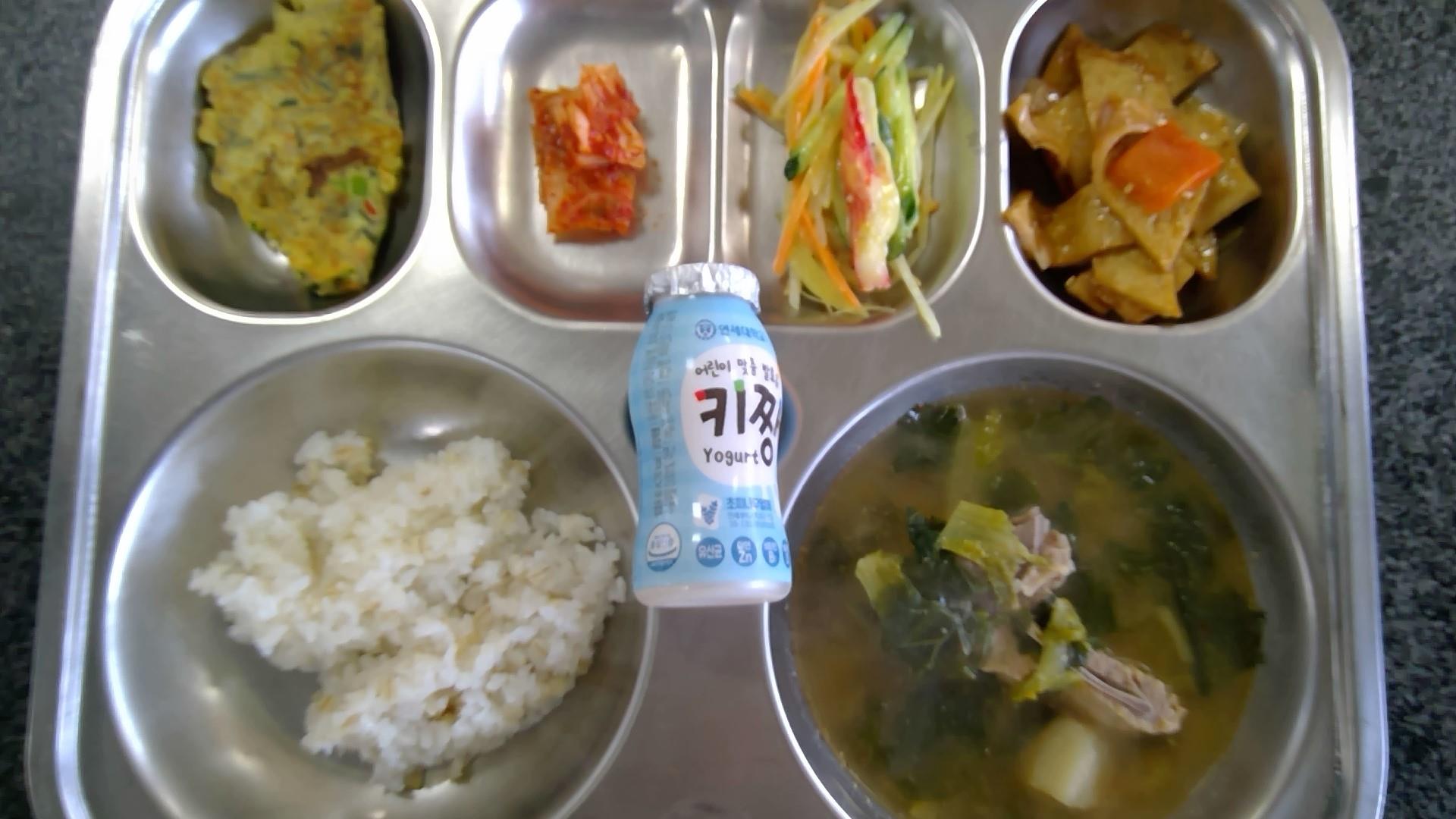 보리밥등뼈감자탕(5.6.8.9.10.18): 염도 0.6%달걀만두(1.6)어묵볶음(1.5.6.13)해파리냉채(1.2.5.6.10.13.15.16)배추김치(9)우유(초)(2)* 에너지/단백질/칼슘/철746.55/38.79/243.32/5.08