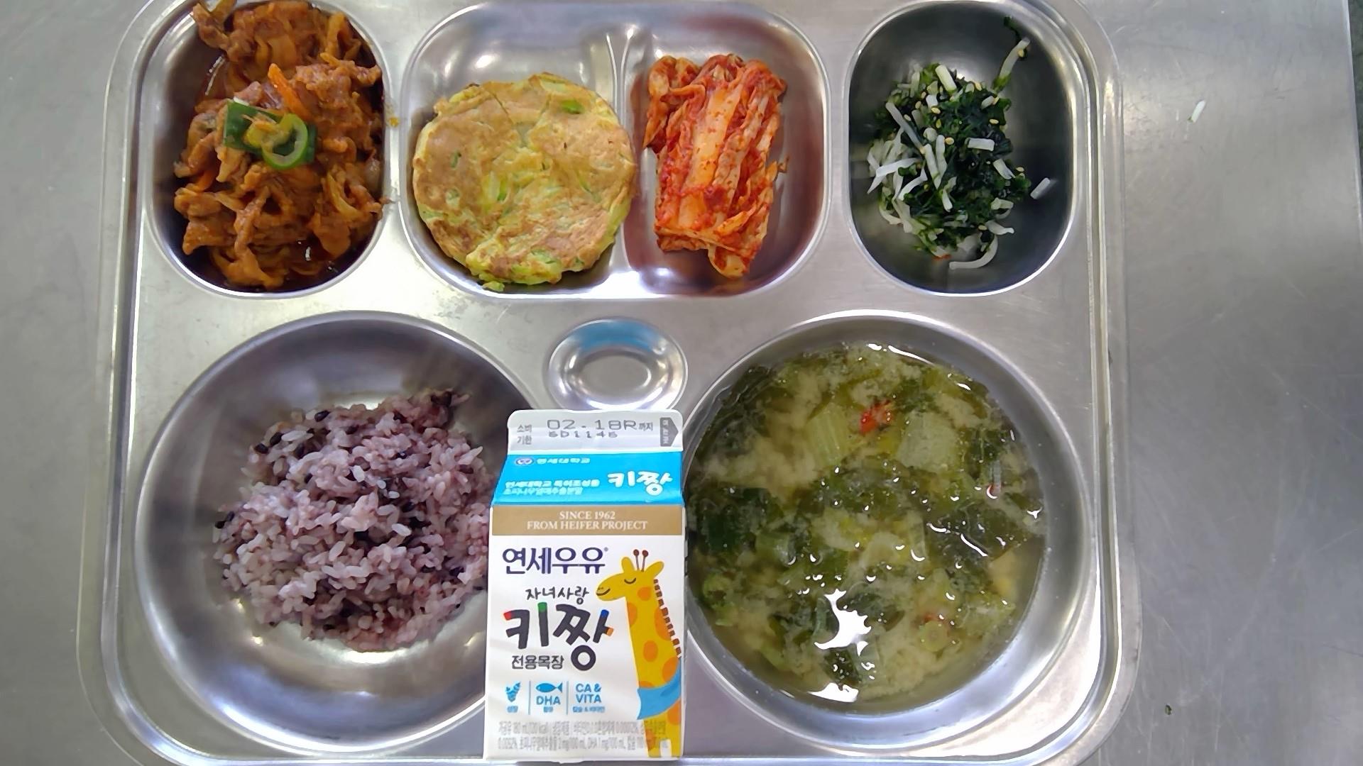 검정쌀밥시락국(5.6.8.9.18): 염도 0.6%제육볶음(5.6.10.13)호박,감자채전(1.6)파래무생채(초)(5.6.13)배추김치(9)우유(초)(2)* 에너지/단백질/칼슘/철637.16/32.89/210.26/2.61