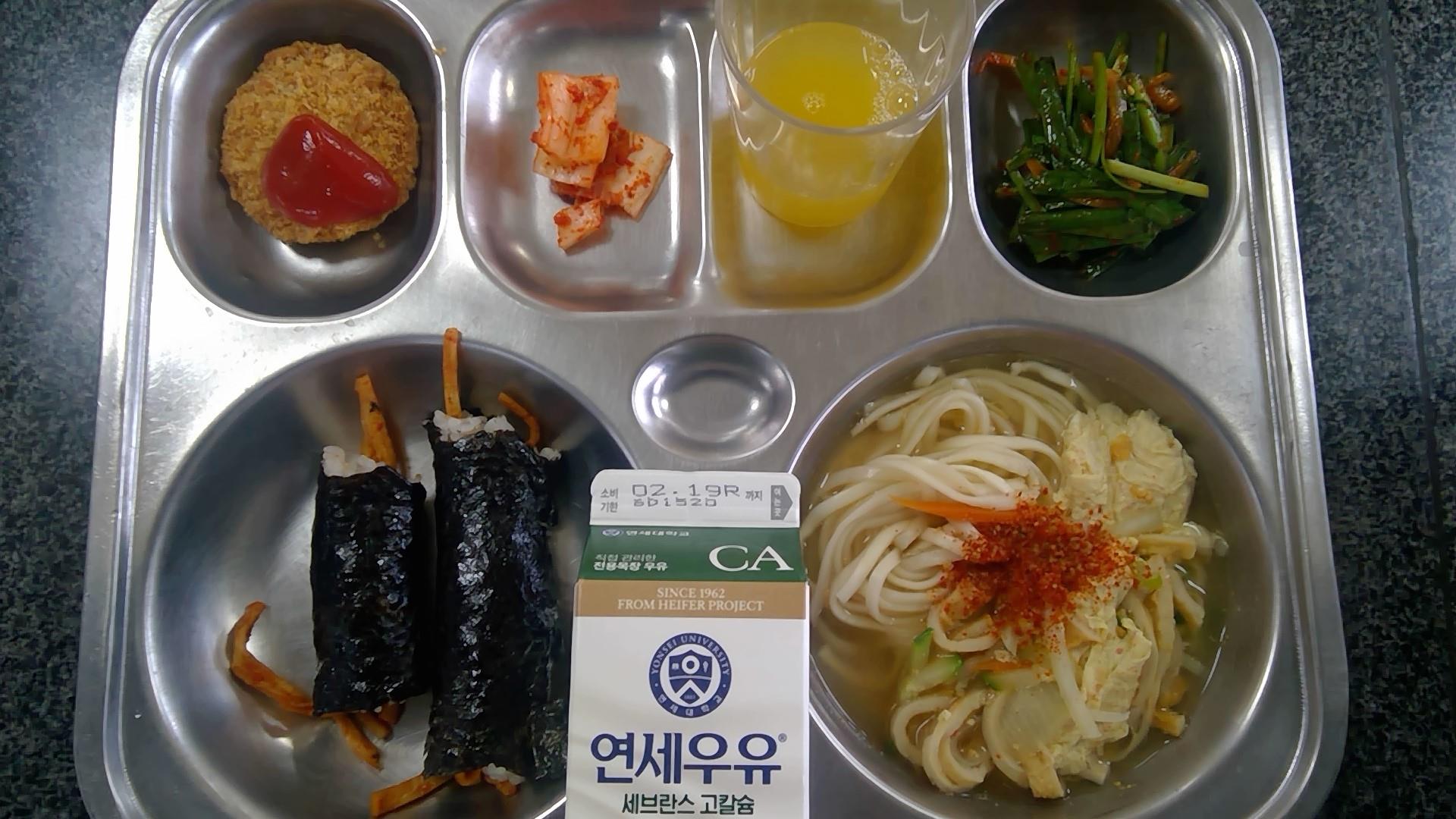 매콤어묵꼬마김밥(1.5.6)베테랑칼국수(1.5.6.8.9.18): 염도 0.6%감자고로케(1.5.6.12)부추겉절이(자율)(5.6.13)배추김치(9)파인애플맛 주스(13)우유(초)(2)* 에너지/단백질/칼슘/철607.56/18.50/185.19/2.30