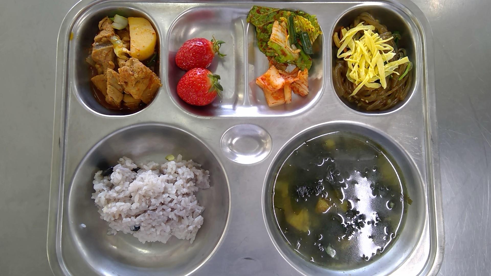 서리태콩밥(5)황태미역국(5.6.8.9.18): 염도 0.6%돼지갈비찜(5.6.10.13)부추잡채(1.5.6.13)봄동달래겉절이(자율)(13)배추김치(9)딸기(설향)* 에너지/단백질/칼슘/철625.92/31.38/143.58/3.76